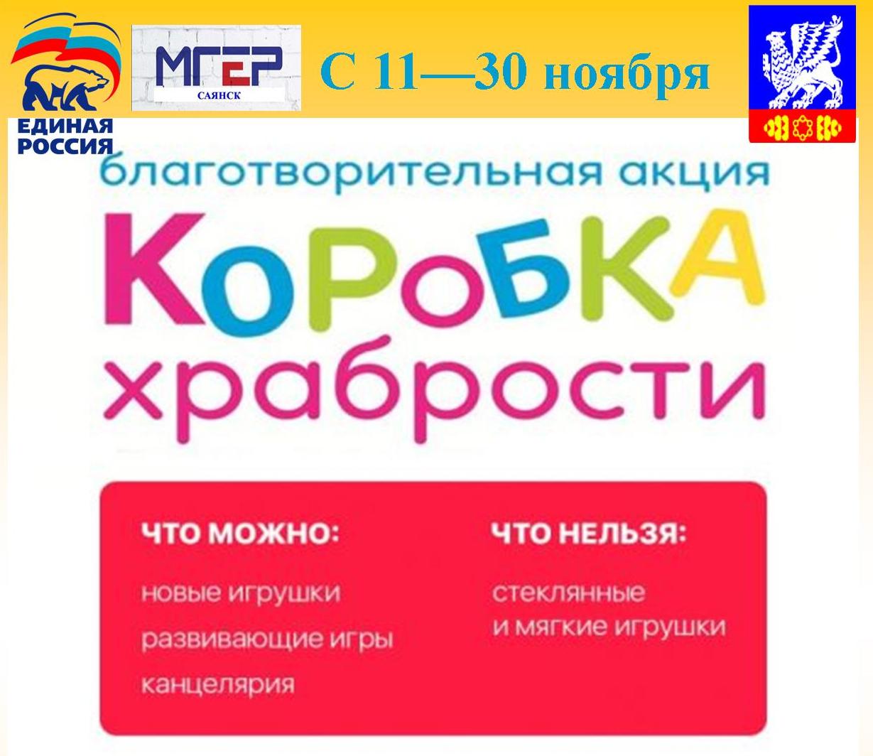 Саянск присоединяется к благотворительной акции «КОРОБКА ХРАБРОСТИ», приуроченной ко Всемирному дню ребенка (20 ноября). Цель акции – поддержка детей, находящихся на длительном лечении в больницах.
