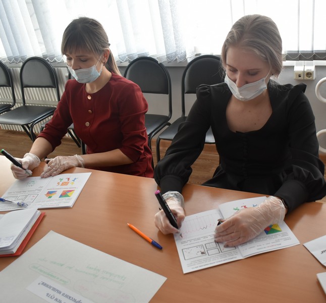 Наставники Ольга Лаптева − учитель школы №4 и Яна Зубова − воспитатель детского сада № 27 «Петушок» представили успешные практики деятельности наставнических пар. Молодой педагог школы № 4 Татьяна Щука прокомментировала индивидуальный образовательный маршрут, а затем на практике отработала со стажерами интерактивные методы и приемы развития творческого мышления детей на уроке в начальной школе.