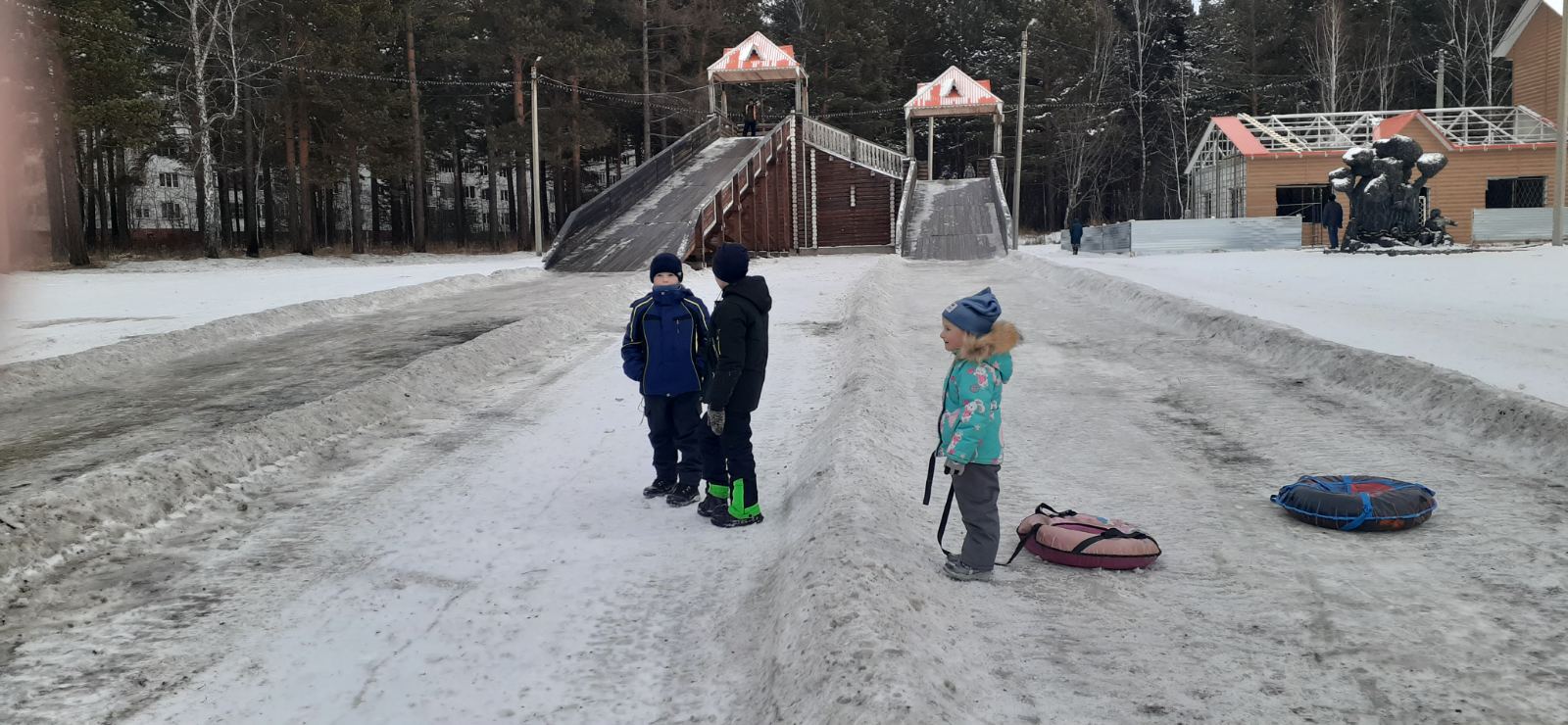 Несколько ребятишек с интересом наблюдают за действиями взрослых. По их словам, они с нетерпением ждут, когда горка будет готова, чтобы вволю покататься на любимой горке.
