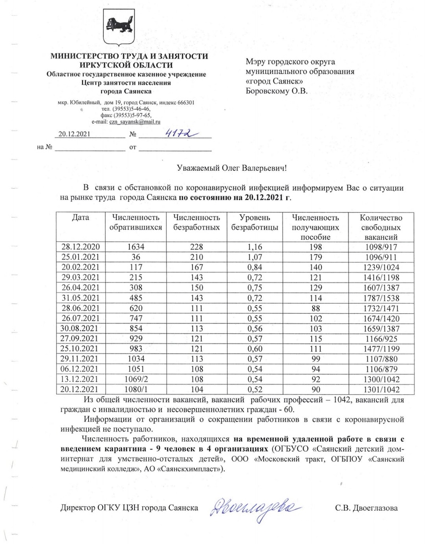 Информация на рынке труда города Саянска по состоянию на 20.12.2021г.