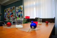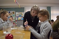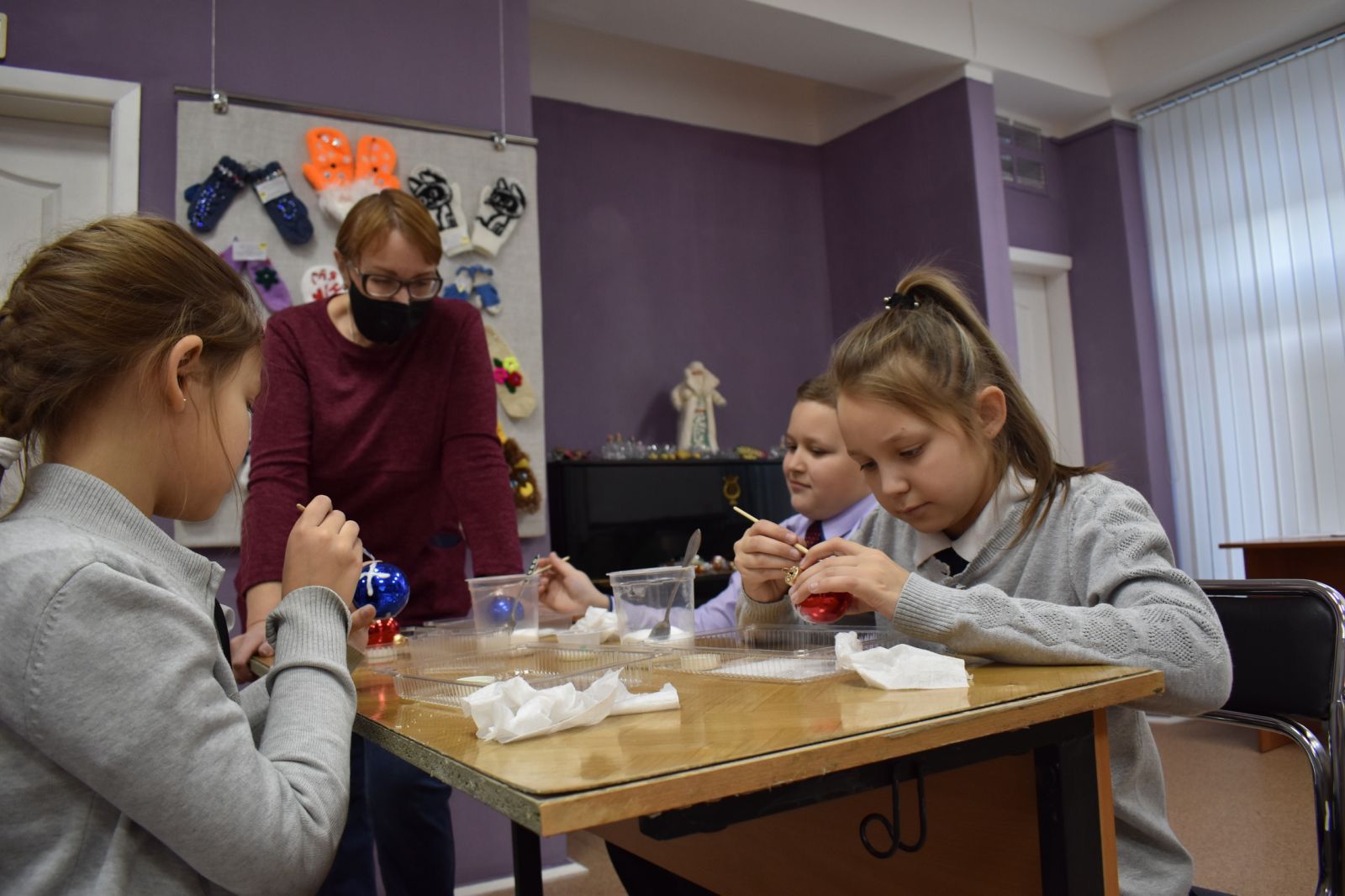 Словно погрузившись в свой маленький мир, девчонки и мальчишки приступили к работе. С помощью кисточки начали появляться различные веточки и снежинки на ярких шарах.