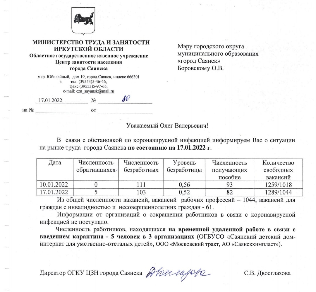 Информация на рынке труда города Саянска по состоянию на 17.01.2022г.