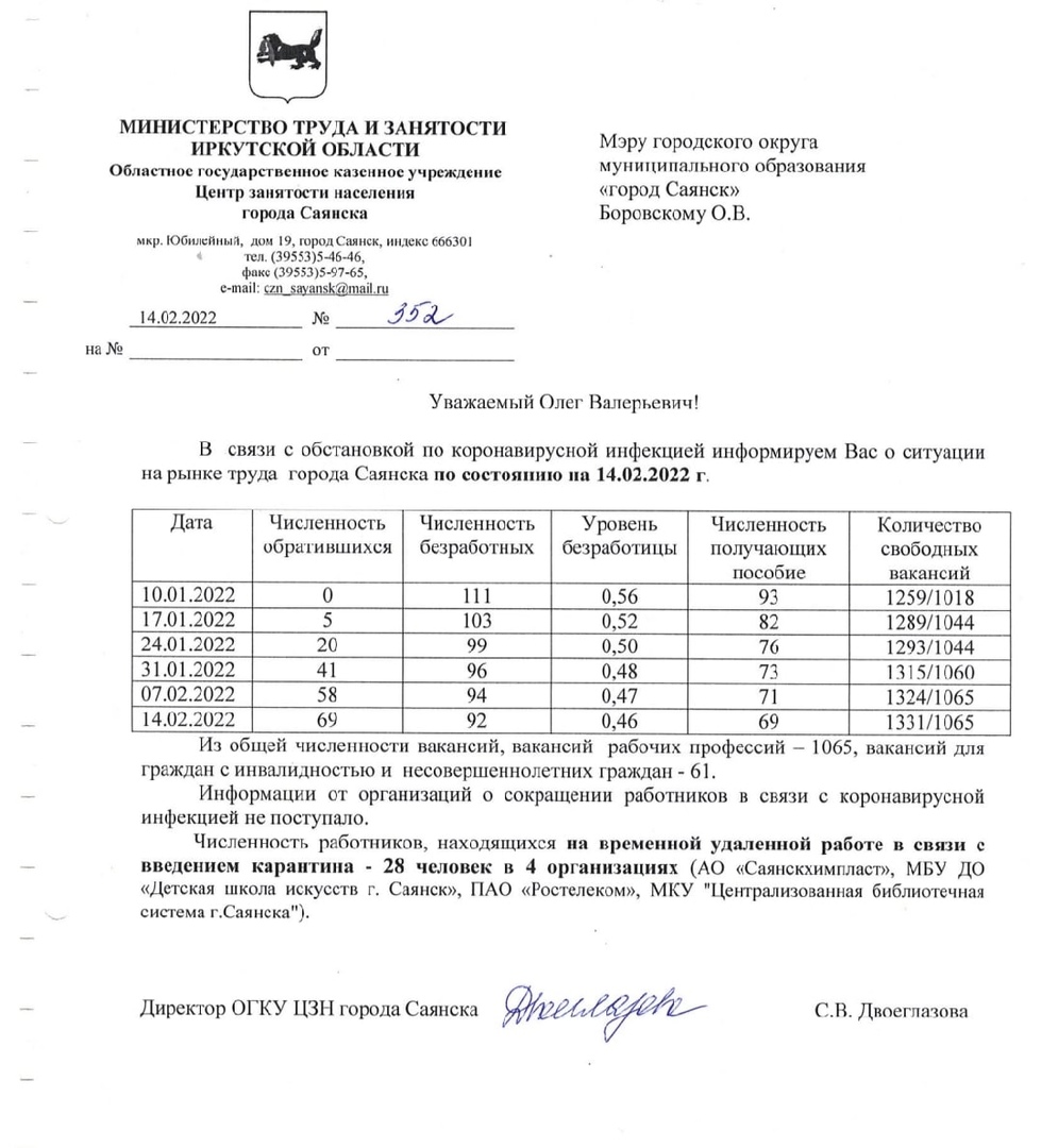 Информация на рынке труда города Саянска по состоянию на 14.02.2022г.