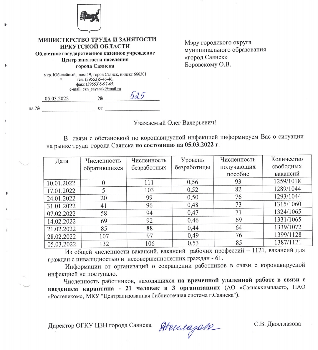 Информация на рынке труда города Саянска по состоянию на 05.03.2022г.