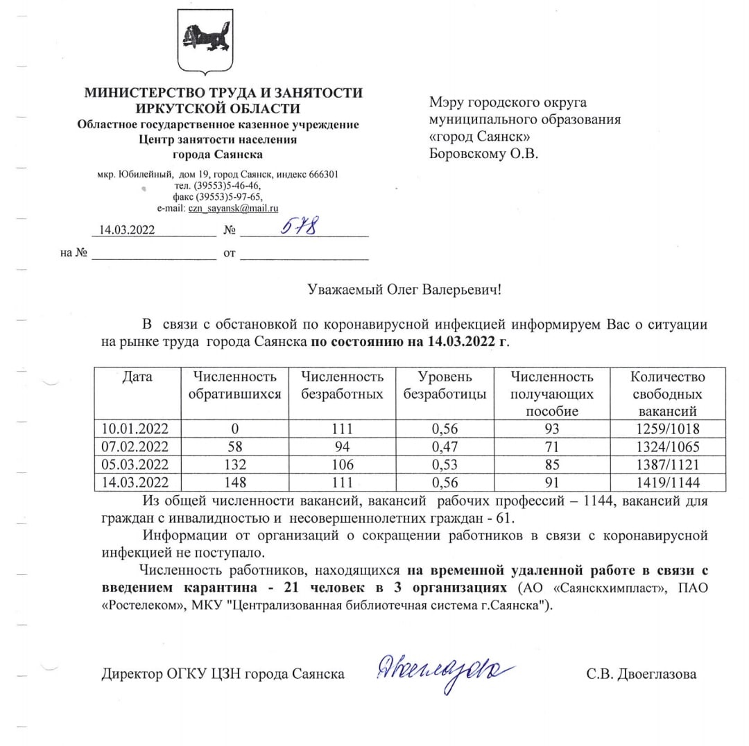 Информация на рынке труда города Саянска по состоянию на 14.03.2022г.