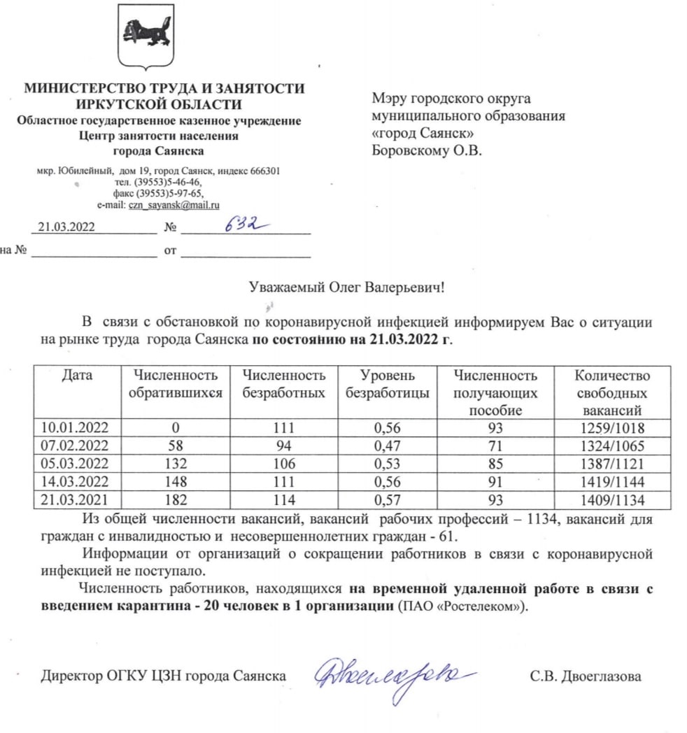 Информация на рынке труда города Саянска по состоянию на 21.03.2022г.