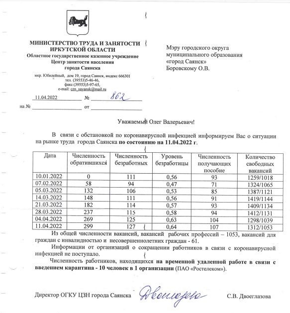 Информация на рынке труда города Саянска по состоянию на 11.04.2022г.