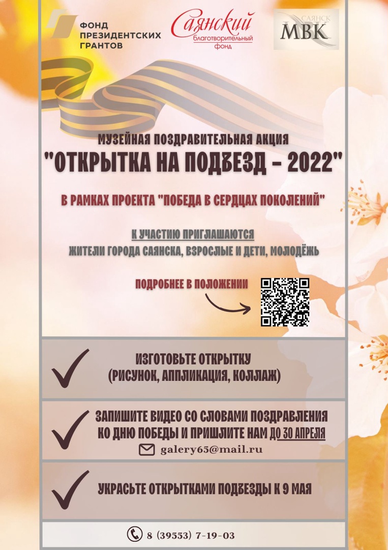 Картинная галерея и Саянский благотворительный фонд при поддержке фонда Президентских грантов в рамках проекта «Победа в сердцах поколений» приглашают жителей города Саянска к участию в акции «Открытка на подъезд».