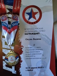 Спортивная школа города Саянска поздравляет своего воспитанника Вадима Окуня с блестящим выступлением в городе Бийске на Сибирском федеральном округе. Вадим выступал в составе сборной Иркутской области. и занял 2 место! В СФО принимали участие 10 регионов Сибири, а в весовой категории Вадима - 71 кг. - участвовало 20 лучших самбистов со всей Сибири. .Вадим, молодец! Мы гордимся тобой! Так держать! Поздравляем родителей Вадима Окуня, которые всегда и во всём поддерживают своего сына! Желаем Вадиму дальнейших успехов и побед!