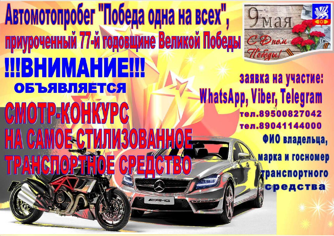 СМОТР оформленных транспортных средств участников городского автопробега состоится 7 мая с 13:00 – 14:00 на площадке возле Дома спорта.