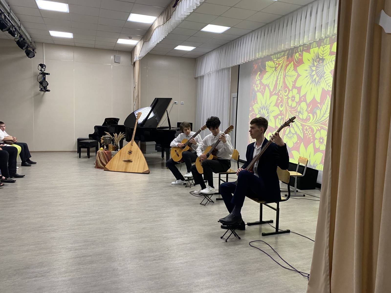 «Восточный танец» в исполнении дуэта гитаристов – Тимура Хабибулина и Леонида Худышкина не оставили зрителей равнодушными. В исполнении выпускников народного отделения Тимофея Полонникова, Никиты Мельникова, Михаила Гареева, Сергея Сараева и Максима Загнеткина прозвучали всем известные музыкальные композиции.