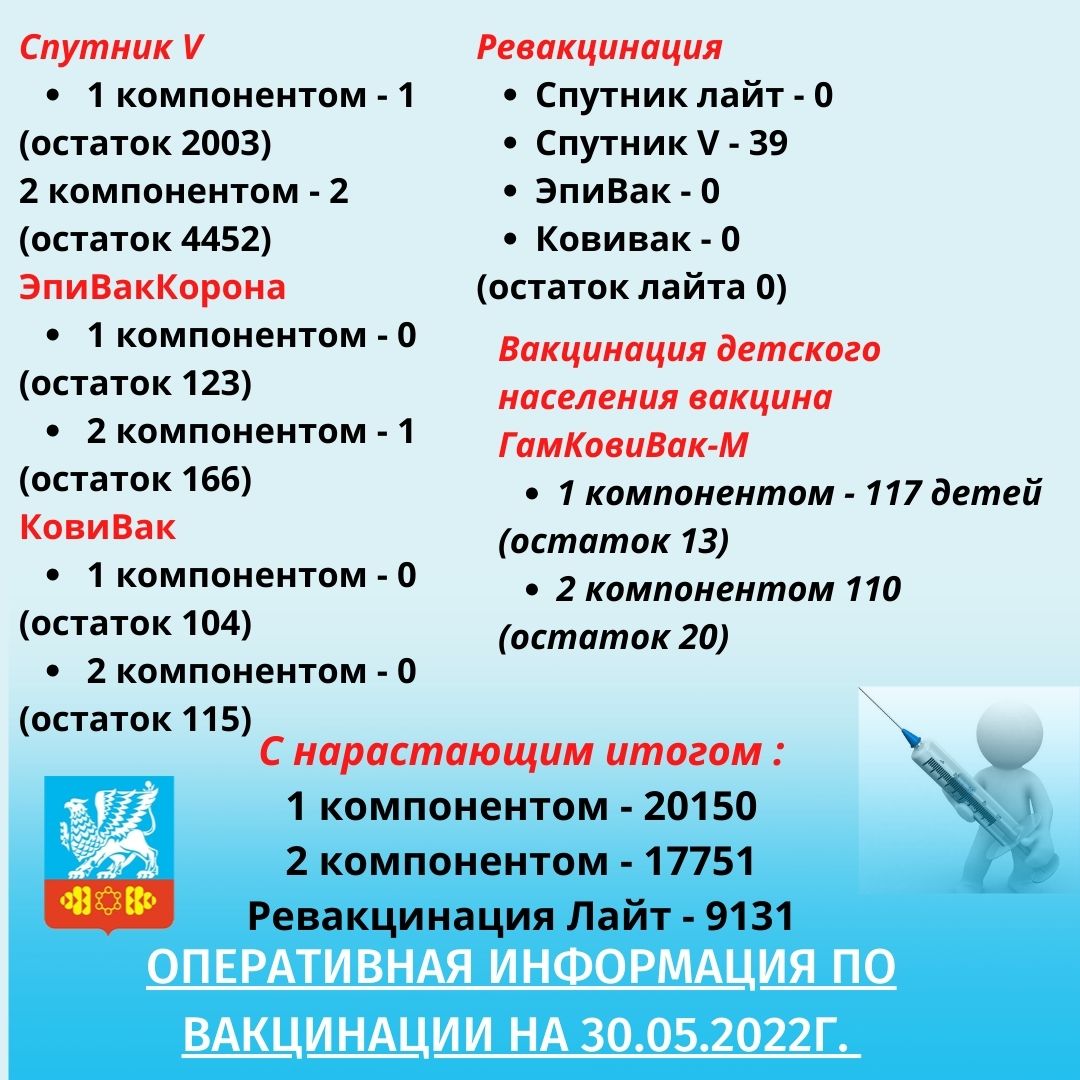 Оперативная информация по вакцинации против коронавирусной инфекции на вечер 30.05.2022г.