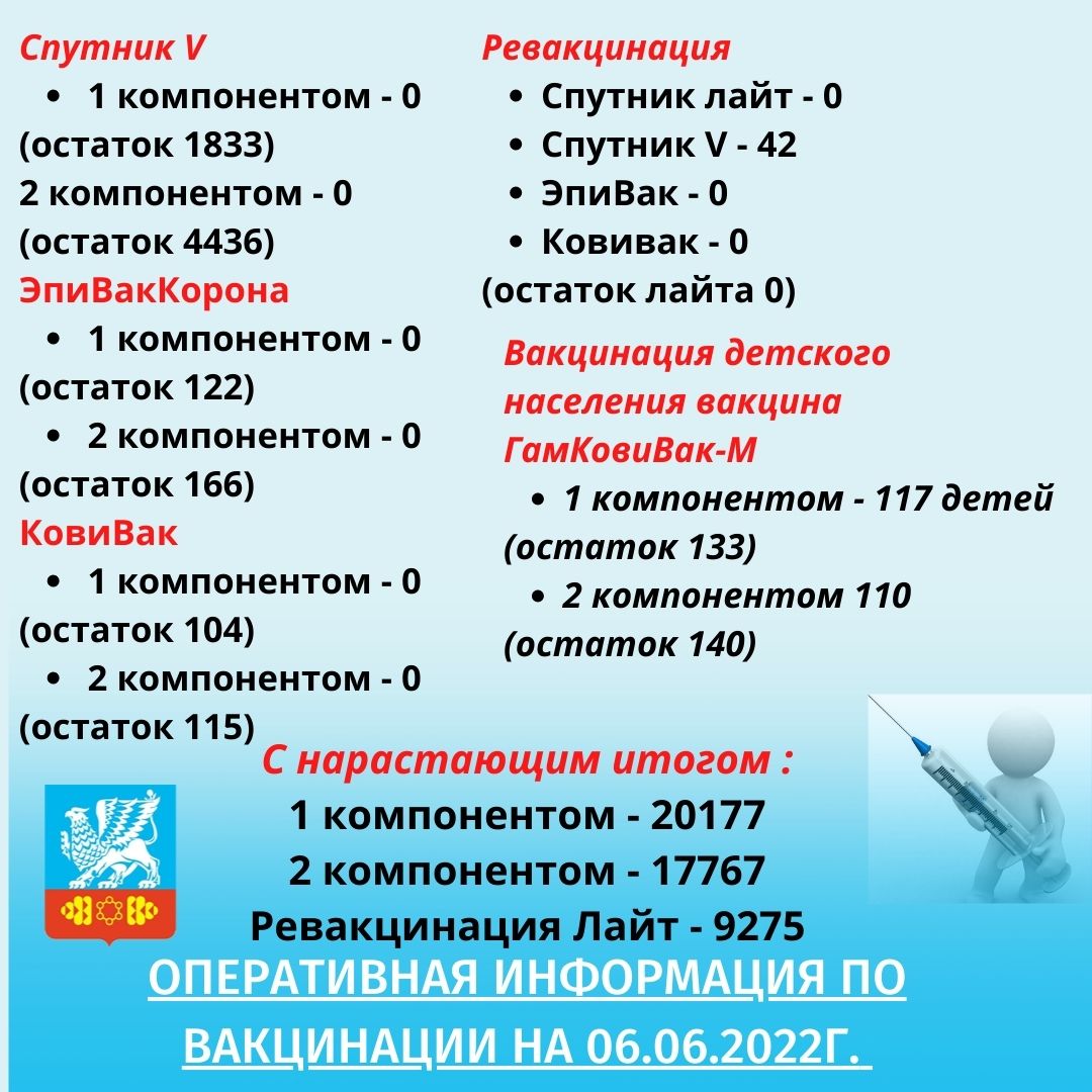 Оперативная информация по вакцинации против коронавирусной инфекции на вечер 06.06.2022г.