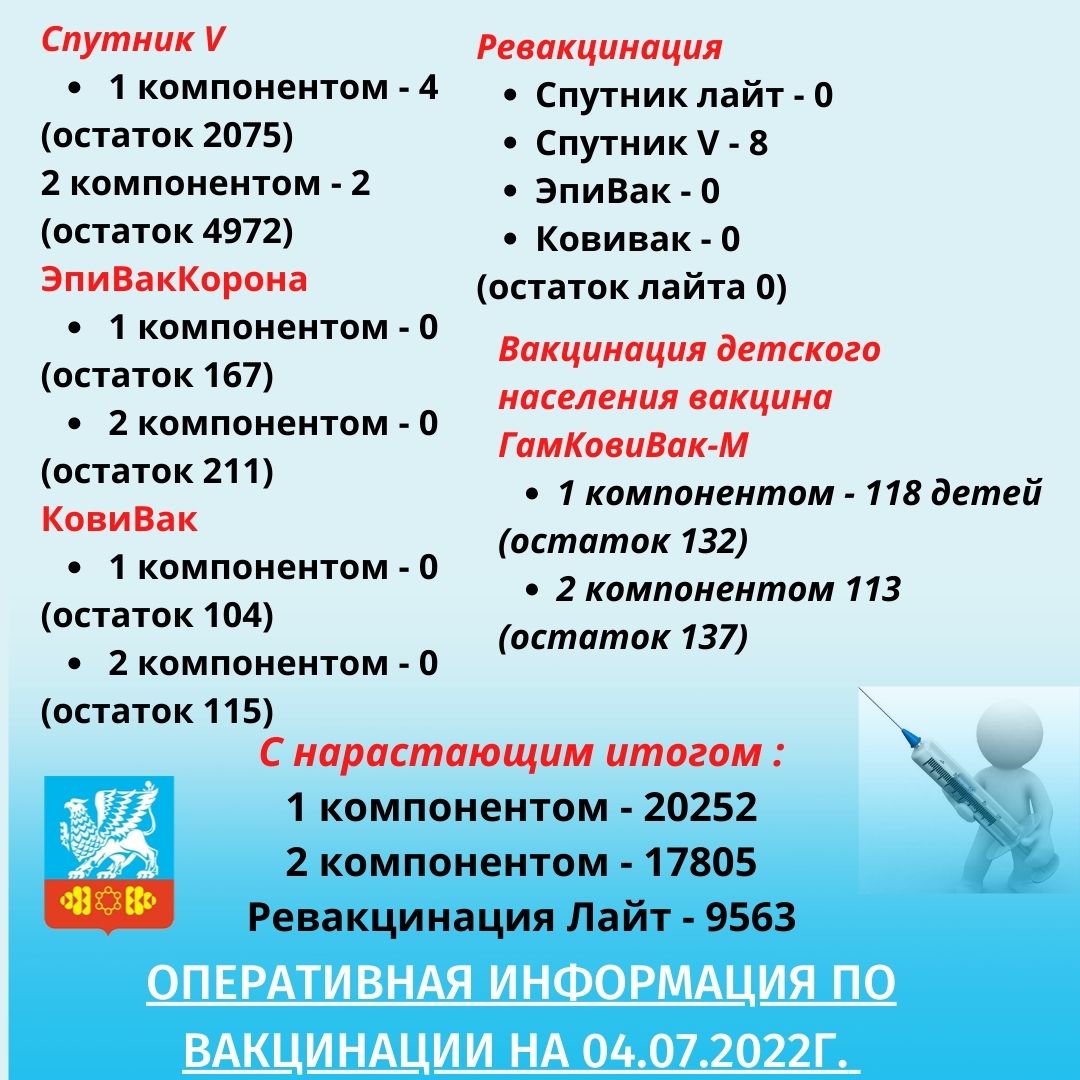 Оперативная информация по вакцинации против коронавирусной инфекции на вечер 04.07.2022г.