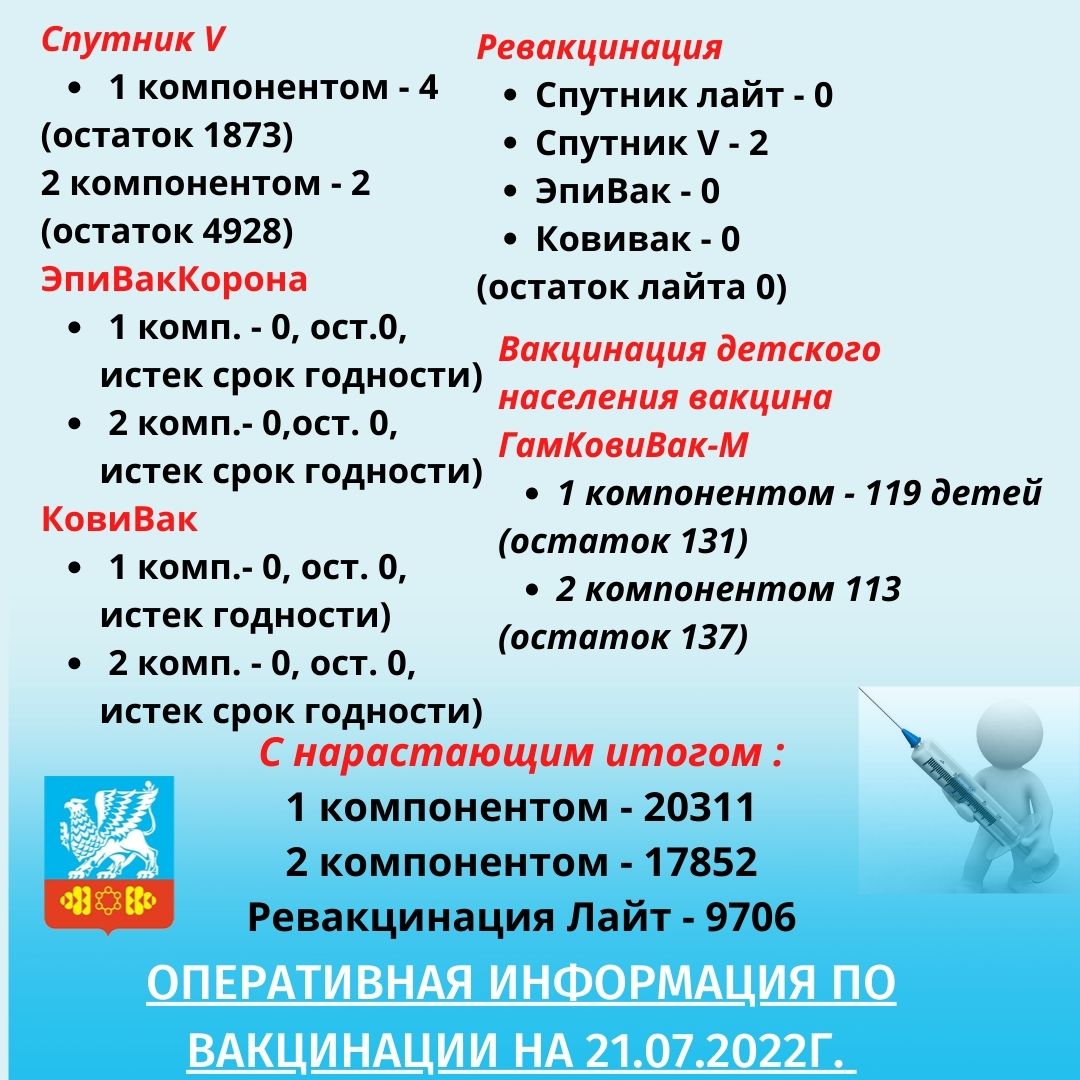 Оперативная информация по вакцинации против коронавирусной инфекции на вечер 22.07.2022г.