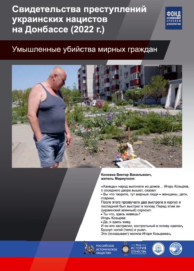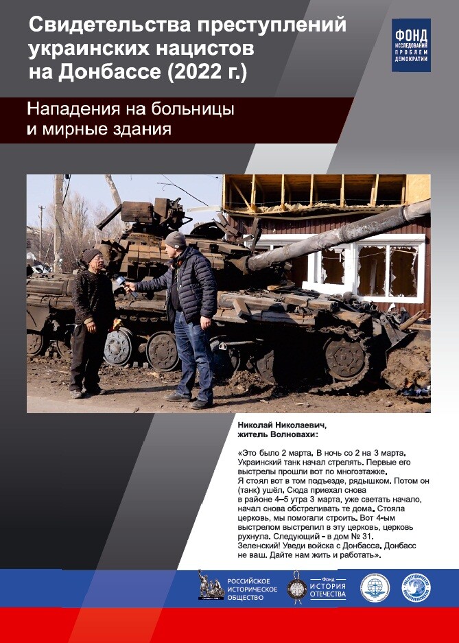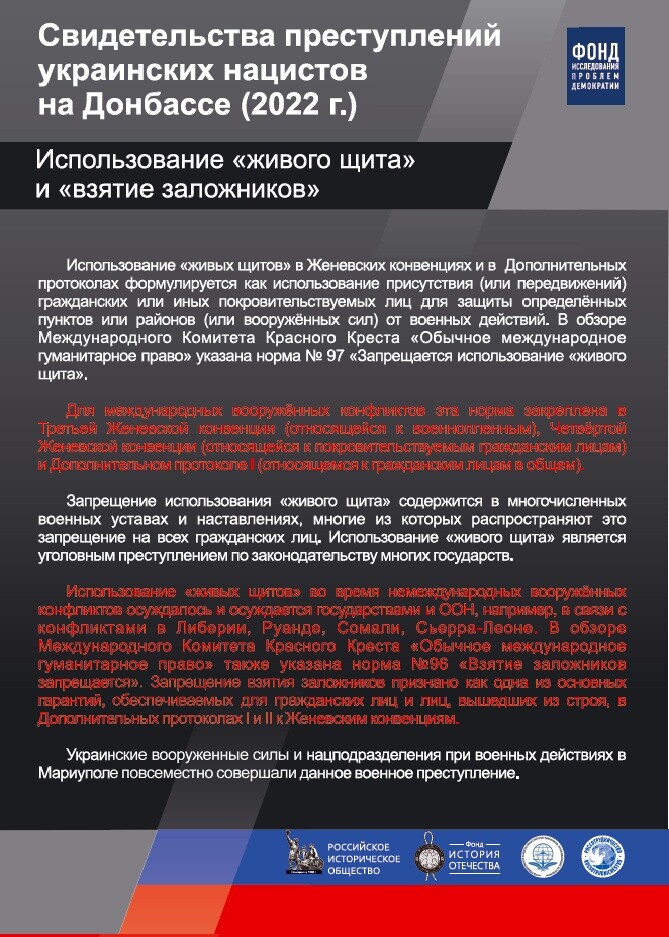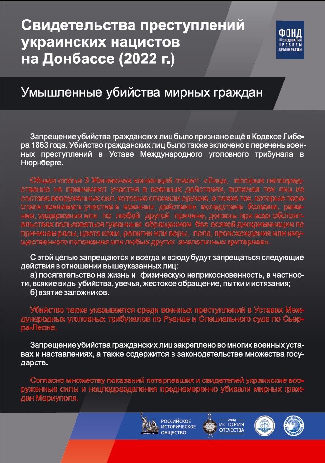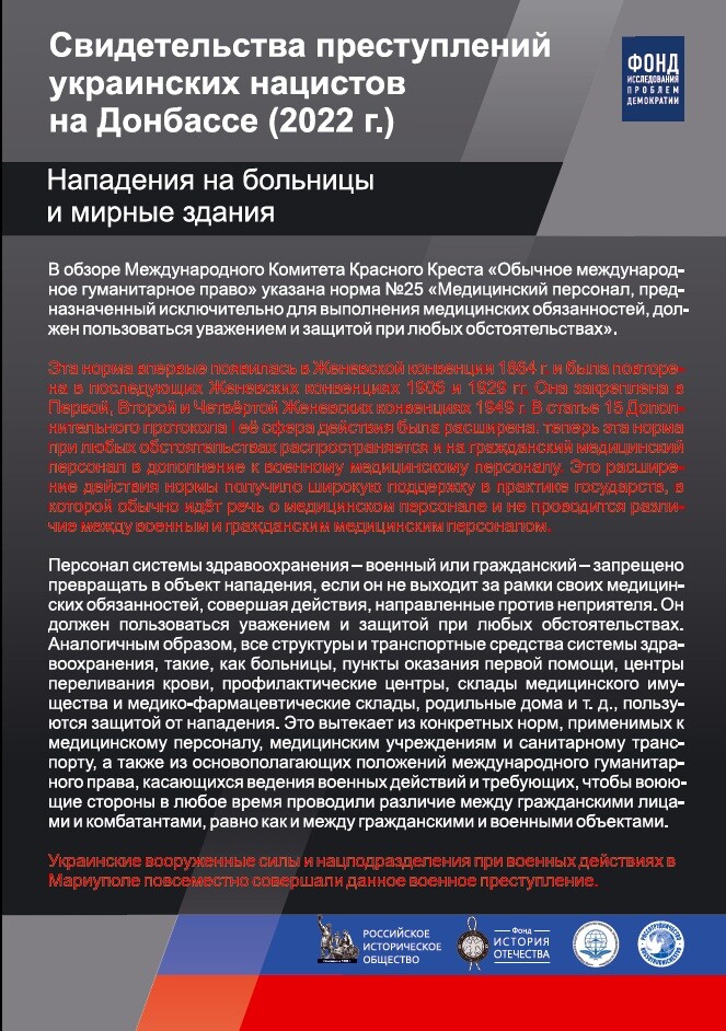 В рамках открытия форума Общественной палаты РФ «Сообщество», в регионах и на площадках Общественных палат субъектов РФ демонстрируется экспозиция, посвященная военным преступлениям против мирного населения на Донбассе - «Свидетельства преступлений украинских нацистов на Донбассе (2022 г.)».