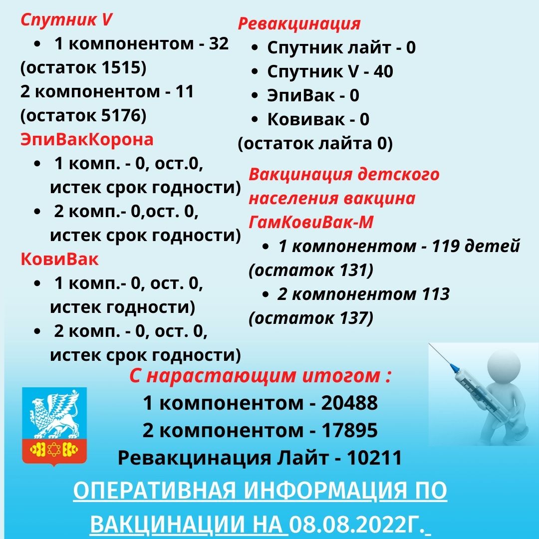 Оперативная информация по вакцинации против коронавирусной инфекции на вечер 08.08.2022г.
