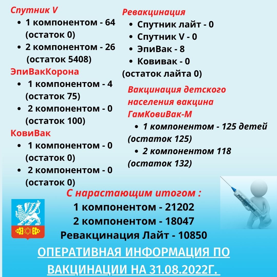 Оперативная информация по вакцинации против коронавирусной инфекции на вечер 31.08.2022г.