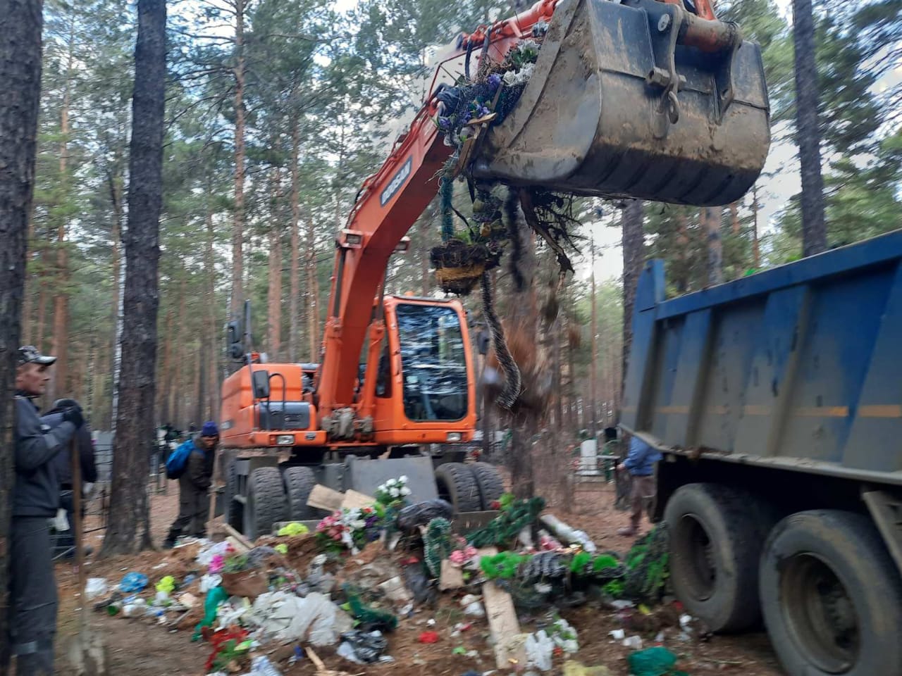 С раннего утра коммунальщики собирали и вывозили с кладбища накопившийся за лето мусор. В основном это были выгоревшие на солнце цветы и венки, старые памятники и даже оградки.
