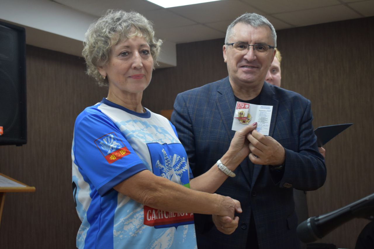 Также в торжественной обстановке заместитель мэра вручил членом команды "Саянские нордики" заслуженные знаки отличия ГТО.