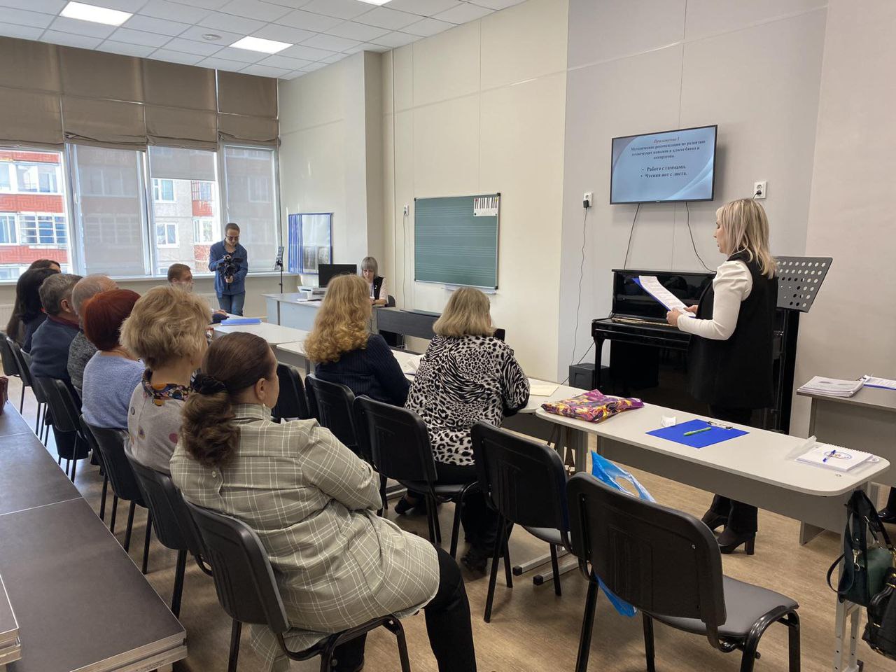 После этого педагоги отправились по секциям, где выступали с докладами и делились опытом организации учебного процесса и проведения уроков. Всего работало четыре секции: «Декоративно-прикладное искусство» и «Изобразительное творчество» в художественном направлении, «Теоретические дисциплины» и «Исполнительское мастерство» в музыкальном.
