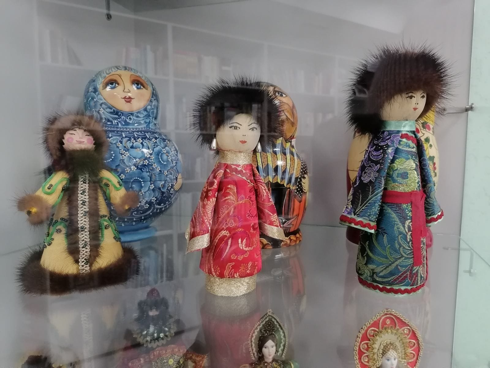 Особое внимание посетителей приковывает коллекция кукол в национальных бурятских костюмах: шикарные меховые шапки, яркие костюмы не оставляют никого равнодушными. Притягивают взгляды и куклы, выполненные из бересты, они украшены замысловатыми узорами и выполнены в разных техниках работы с природным материалом.