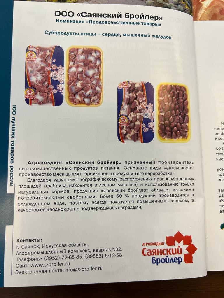 – «Саянский бройлер» традиционно принимает участие в конкурсе «100 лучших товаров России». Нынешний диплом лауреата еще раз подтверждает качество нашей продукции, – сказал директор «Саянского бройлера» Александр Романовский.