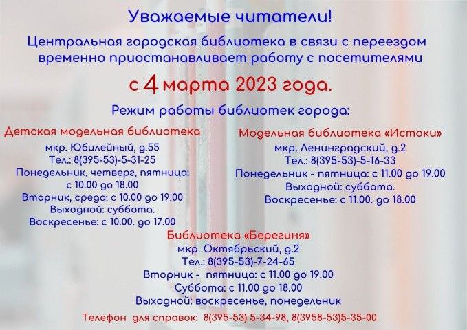 Центральная городская библиотека в связи с переездом временно приостанавливает работу с посетителями с 4 марта 2023 года.