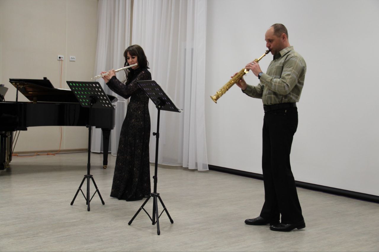 Особый номер подготовили преподаватели отделения по флейте и саксофону Вера Александрович и Алексей Жевлаков. Они виртуозно исполнили композицию под названием «Вижу только тебя», чем покорили всех зрителей.