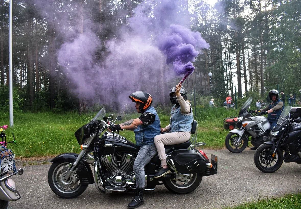 Рев мотора, сила и мощь железных коней в клубах цветного дыма. Своим эффектным появлением участники мотопробега «Молодость = движение» удивили собравшихся на празднике.