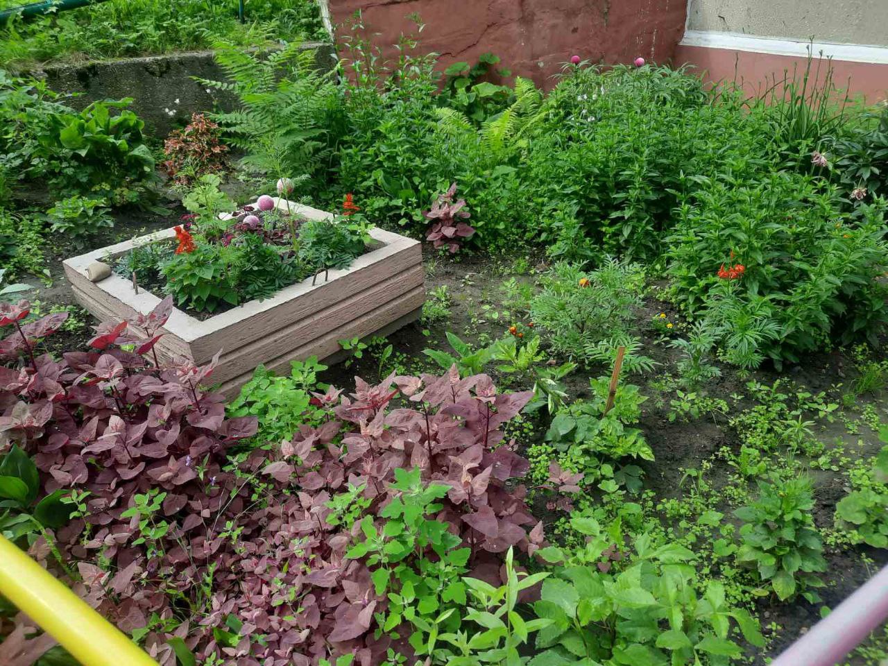 В июле во дворе - самое активное цветение, ещё не осыпались пышные шапки пионов, благоухают бархатцы, настурция и любимая петуния. Немало, по словам Людмилы Солодковой, было посажено многолетников. Ею, к примеру этой весной высажен куст белой сирени, которой уже вписался в местный колорит.