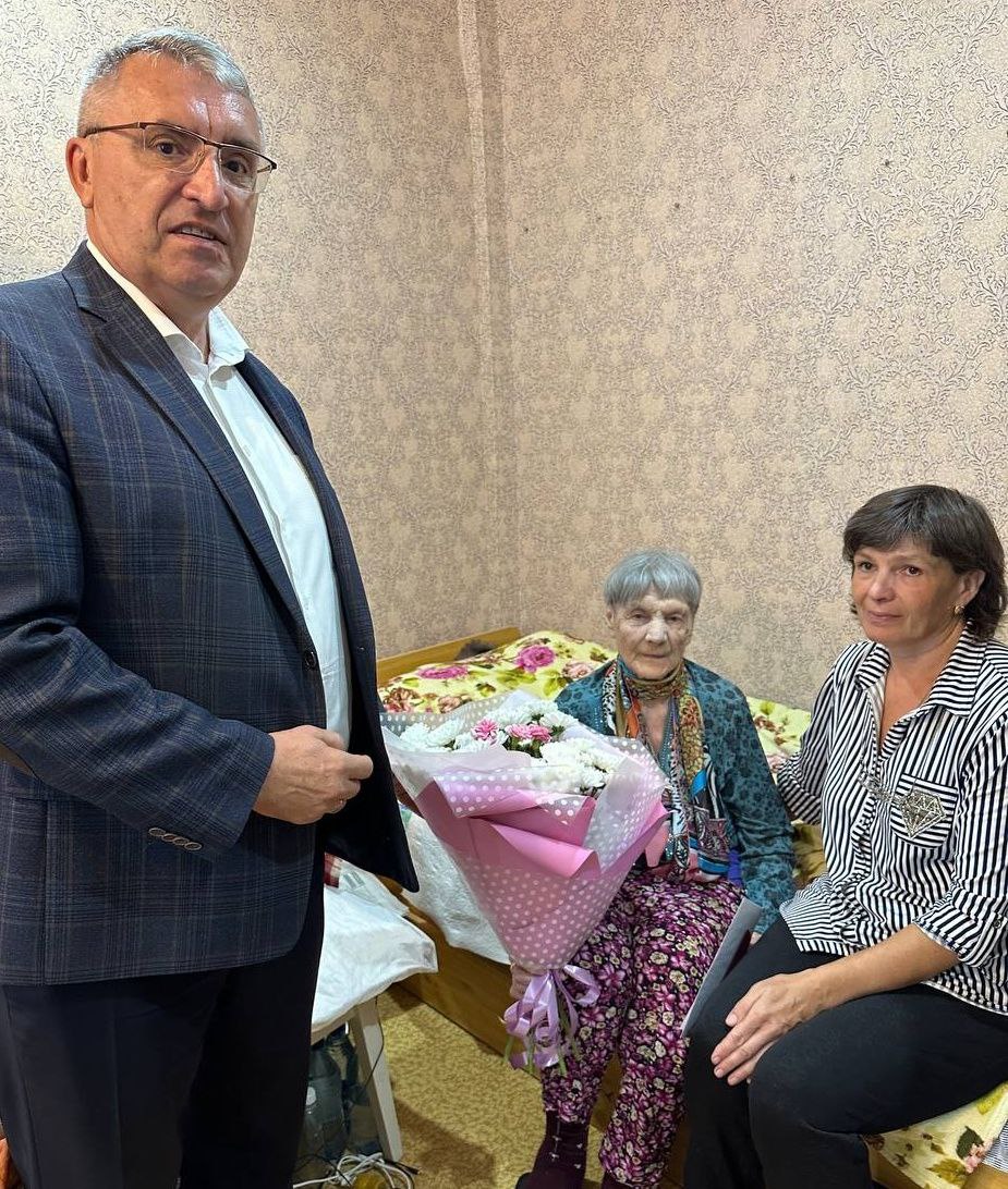 К поздравлениям присоединился директор управления социальной защиты населения города Саянска Сергей Кривопалов. Он передал приветственный адрес от Президента Российской Федерации Владимира Путина, пожелал бодрости духа и оптимизма, а также выразил надежду, что на 95-летие почетные гости также придут к женщине домой с подарками.