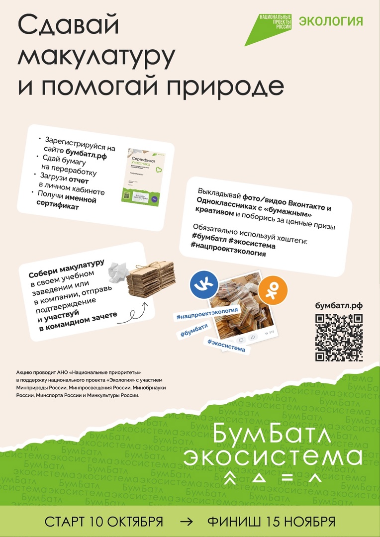 Администрация городского округа муниципального образования «город Саянск» информирует граждан нашего города, что в рамках национального проекта «Экология» на территории Российской Федерации проводится четвертый сезон акции «БумБатл 2023», который стартовал 10 октября 2023 года.