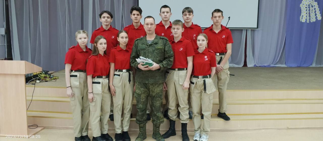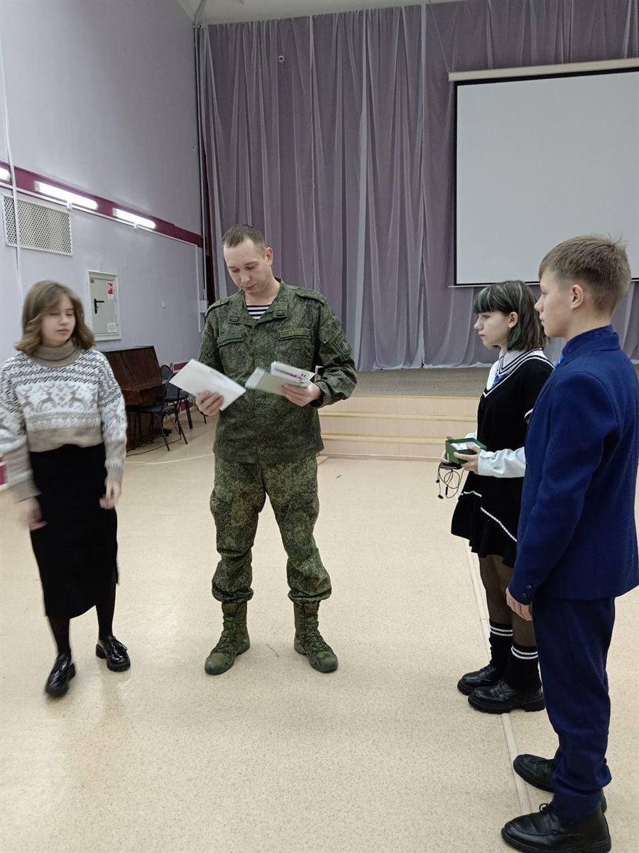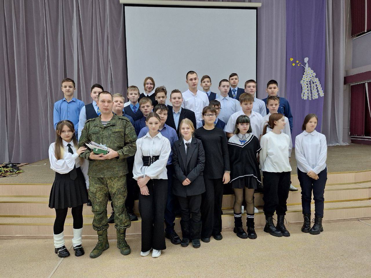 Стало доброй традицией приглашать участников специальной военной операции, прибывших в отпуск, на школьные классные часы. Ребята всегда с радостью принимают участие в таких мероприятиях, потому что хотят из первых уст услышать о подвигах наших бойцов на передовой.