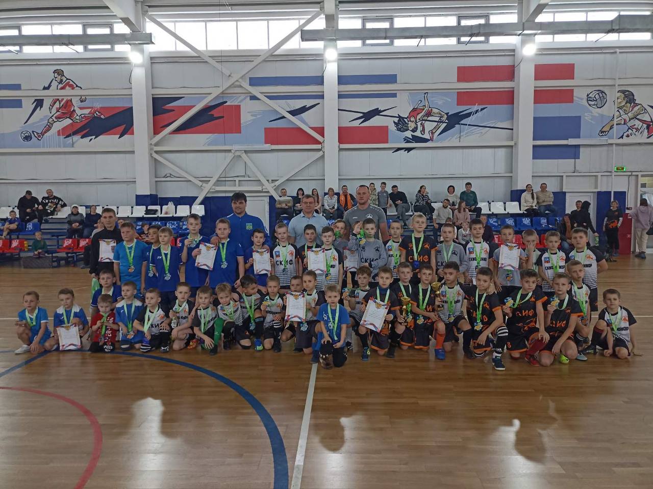 Наши спортсмены были самые многочисленные: на паркет нового физкультурно-оздоровительного комплекса "Урожай" вышли 32 юных футболиста "Скифа".