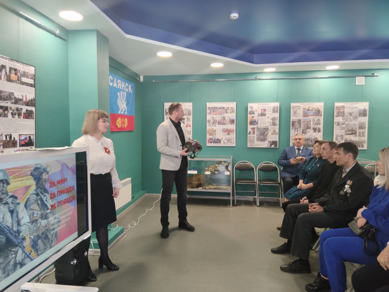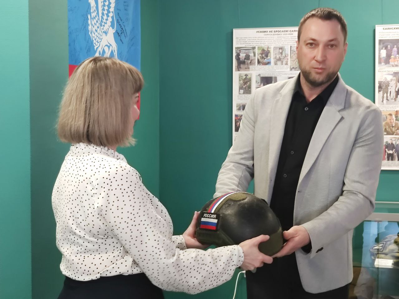 Председатель Саянской городской Думы Евгений Каплин передал в дар музею каску, которая принимала участие в боевых действиях и спасла жизнь российскому солдату. Бронешлем из последней поездки в зону СВО привезли Боровский Олег Валерьевич и Каплин Евгений Александрович.