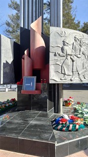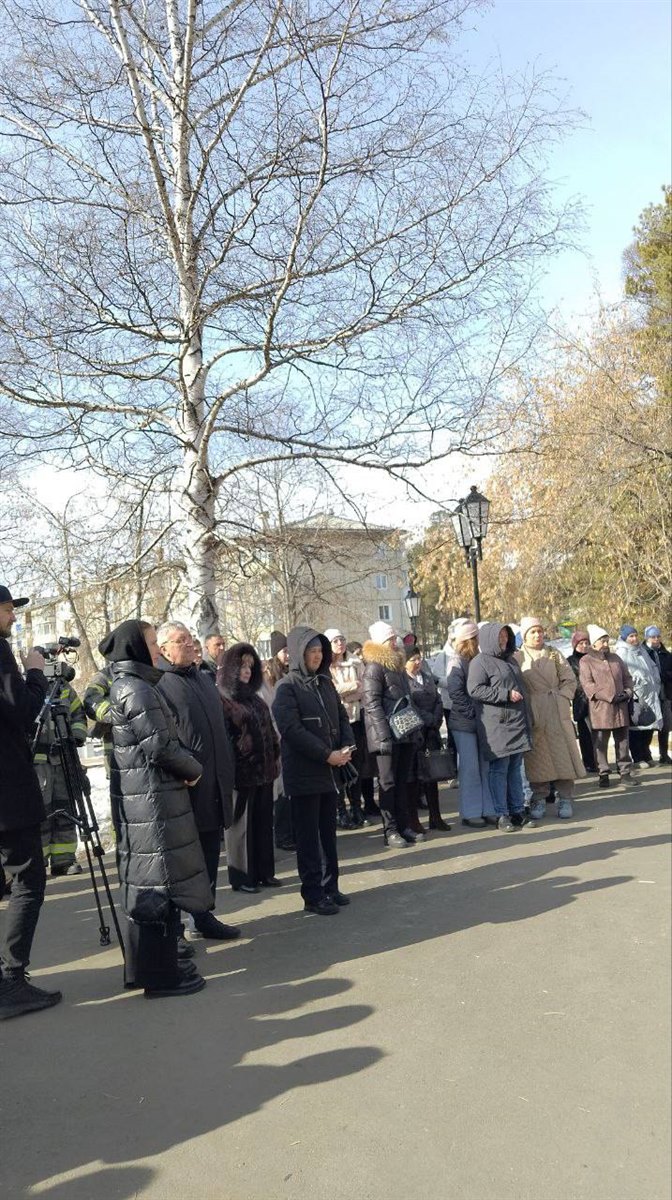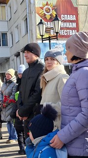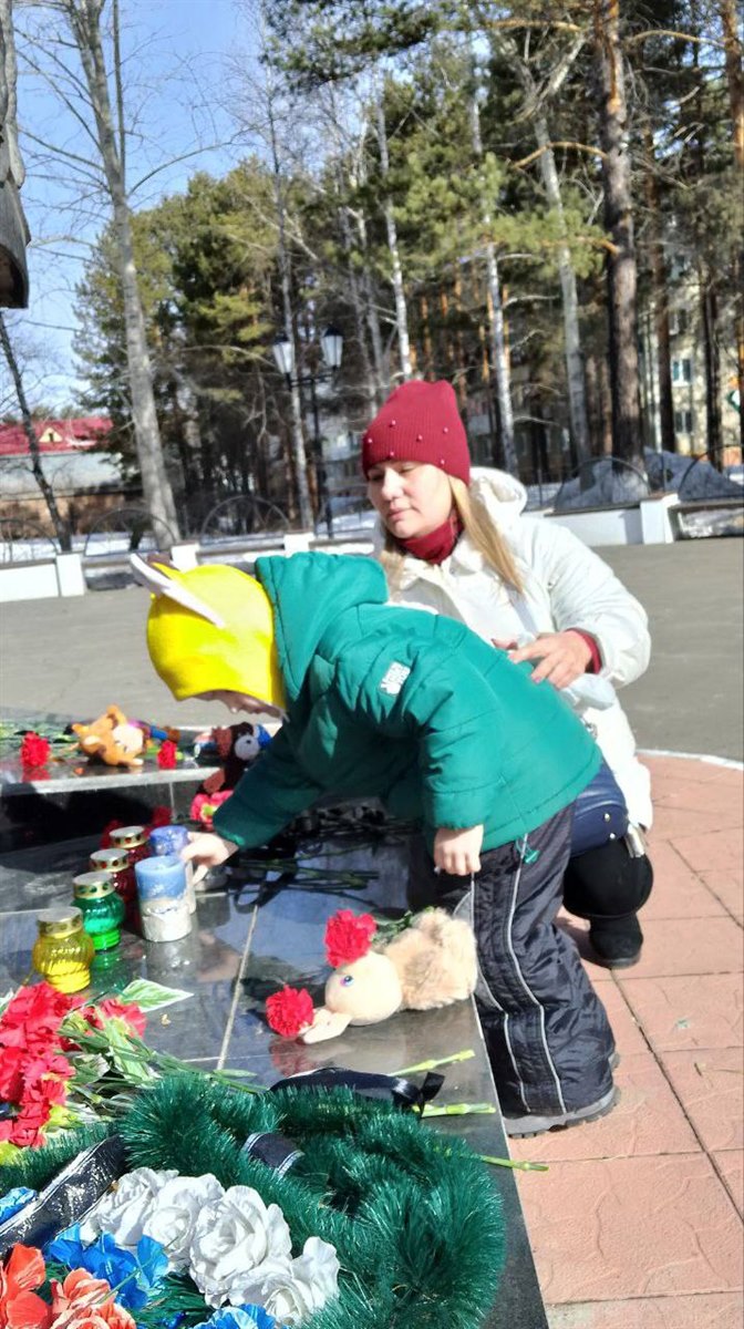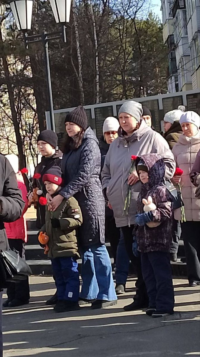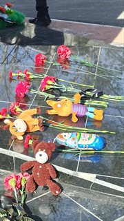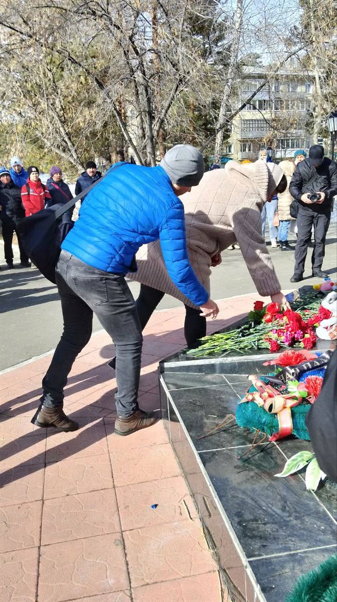 Со слезами на глазах люди приносят гвоздики, игрушки к стеле Защитников Отечества. Исполняющий обязанности мэра Саянска Александр Ермаков призвал почтить собравшихся минутой молчания.