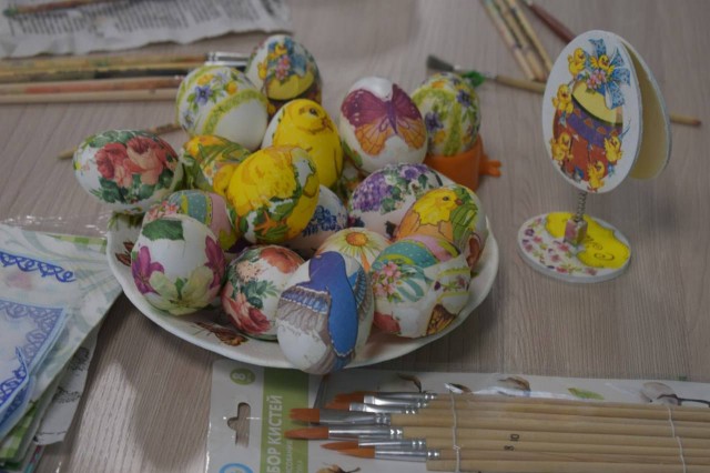 Используя яркие салфетки и фантазию, мастерицы создали на яйцах красивые орнаменты, продолжив славные традиции наших предков.