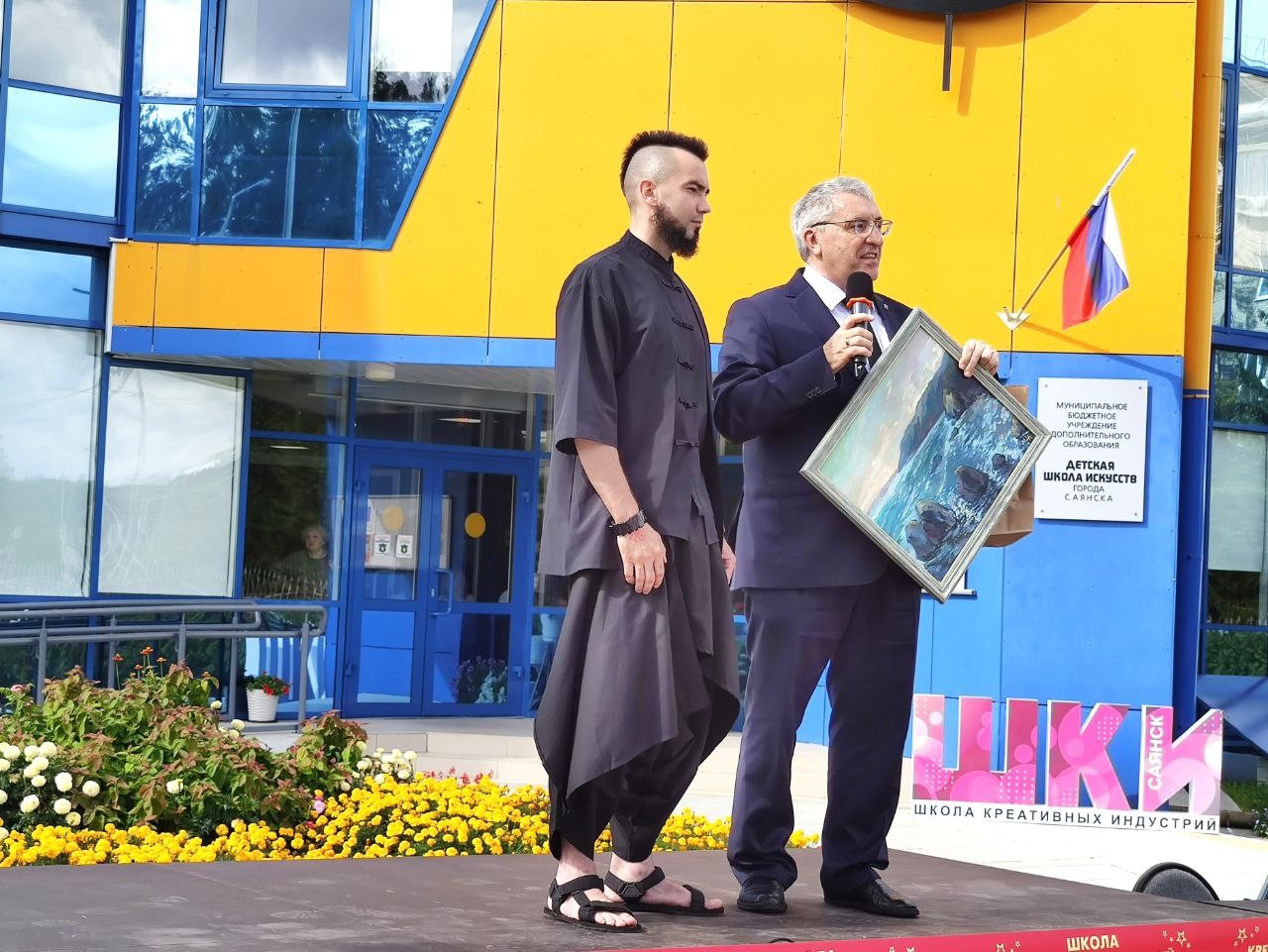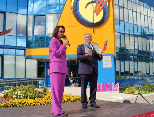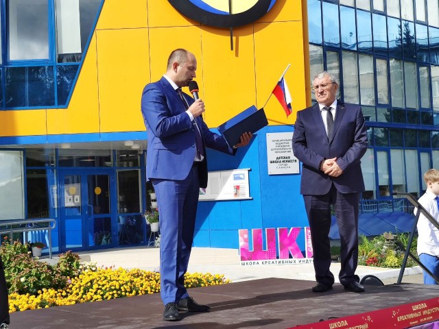 Депутат Законодательного Собрания Иркутской области по округу №16 Дмитрий Мясников поздравил саянцев с открытием школы и вручил Благодарственное письмо от Сенатора Российской Федерации Андрея Владимировича Чернышева Ермакову Александру Владимировичу за успешную реализацию национального проекта "Культура", федерального проекта Всероссийской политической партии "Единая Россия", "Культура малой Родины" на территории Иркутской области.