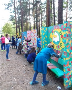 Недавно предприниматели закупили акриловые краски, разноцветный колер, кисти, перчатки – словом, всё необходимое для творчества под открытым небом. В свою очередь, педагоги ДХШ занялись созданием эскизов рисунков, выполненных в русском народном стиле. И во второй половине дня 2 июня состоялось воплощение совместной идеи в реальность.