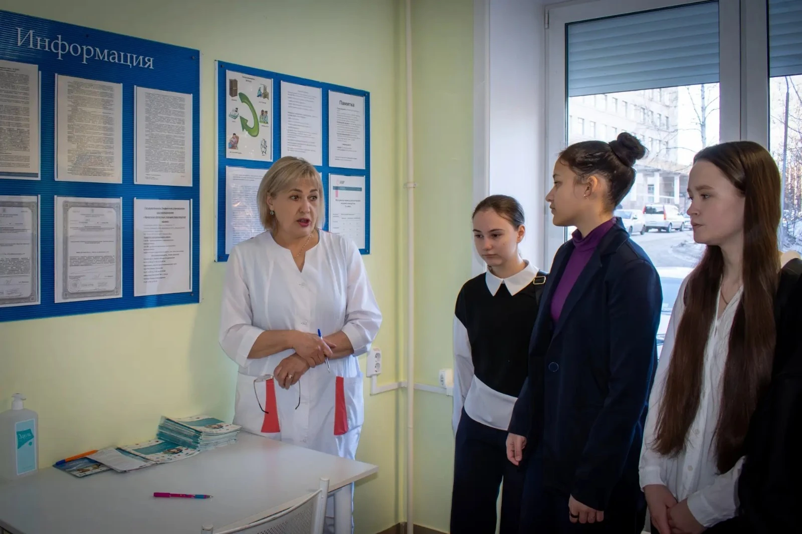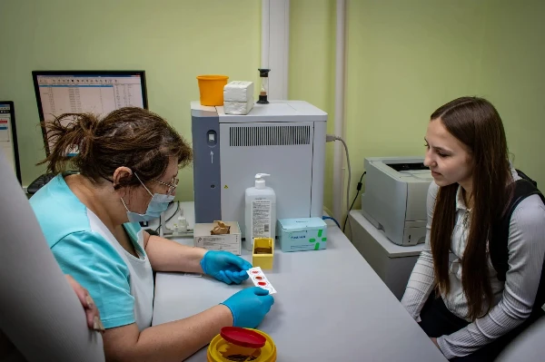 Заведующий филиалом, Русанова Марина Александровна, рассказала участникам экскурсии, как проходит «путь донора»: от регистратуры до кабинета сдачи крови. Ученица 8 «Б» класса МОУ «СОШ№3» Тесакова Виктория, прошла медицинскую процедуру по определению своего резус-фактора: в лаборатории у нее был взят образец крови, который затем исследовали с использованием специальных реагентов.