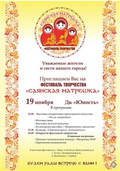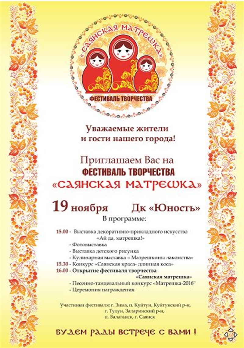 Разнообразные образы матрешек можно будет увидеть на фестивале «Саянская матрешка», который пройдет 19 ноября в ДК «Юность»(г. Саянск, м-н Юбилейный, 36). Приглашаем жителей и гостей нашего города принять участие в фестивале творчества «САЯНСКАЯ МАТРЕШКА»! В рамках фестиваля будут проведены: