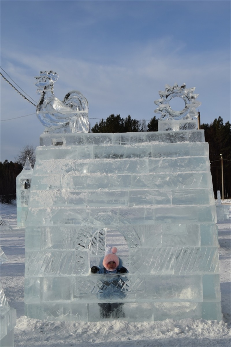 Сложные элементы выточены резчиками по льду в скульптурах Деда Мороза и Снегурочки, взлетевшего на конёк избушки символа Нового года – Петушка. Творческая фантазия прослеживается в декоративной резьбе столбов и елочек, в каждой грани хрустального материала. Работы сделаны с душой. Ледяная избушка и замок, композиции ледяных облаков, маленькие горки и множество елочек удачно совмещены в игровую и сказочную зоны для озорных игр и зимних забав детей.