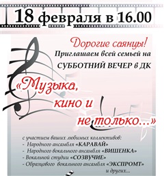 Дворец культуры «Юность» предлагает жителям и гостям нашего города посетить мероприятие в формате семейного отдыха. Субботним днем 18 февраля 2017 года, предлагаем встречу с творческими коллективами города в рамках проекта «Музыка, кино и не только…». Удобное время начала мероприятия – 16.00 – позволит взрослым и детям стать участниками программы. Познавательные и музыкальные номера встречи будут интересны всем присутствующим! В концертной программе –солисты и коллективы, нашего города, а так же участники, чье появление будет для саянцевприятным и неожиданным сюрпризом! Вечер семейного отдыха состоится 18 февраля в 16 час во Дворце культуры «Юность». Организаторы мероприятия обещают много музыки и хорошего настроения!