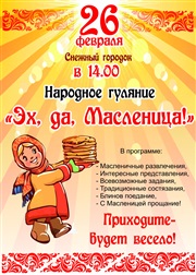 Приглашаем в воскресенье, 26 февраля, отведать блинов, увидеть состязания ловких и сильных, услышать знакомые мелодии народных песен на массовом народном гулянии «Эх, да Масленица! »
