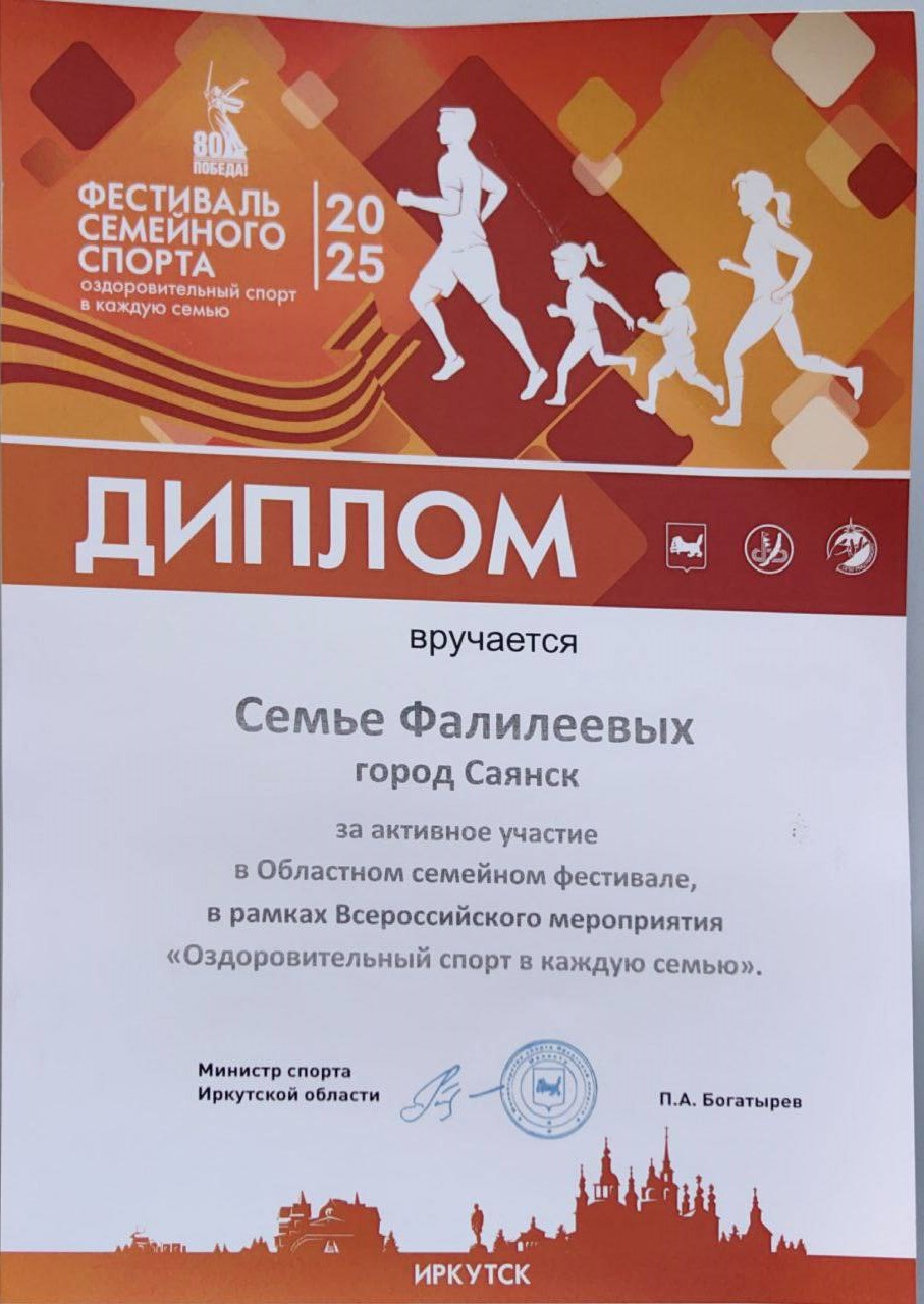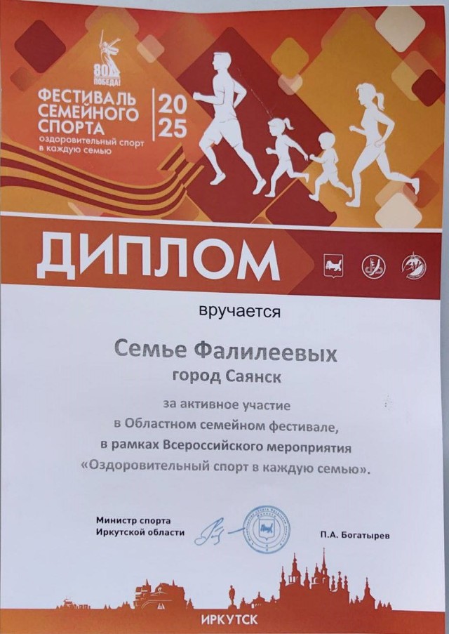 В фестивале «Оздоровительный спорт – в каждую семью» приняли участие семьи из 20 муниципальных образований региона, в состав которых входили двое взрослых и один ребёнок в возрасте от 9 до 15 лет. Город Саянск представляла команда семьи Евгения, Людмилы и Артёма Фалилеевых. Они вошли в десятку самых спортивных семей фестиваля.