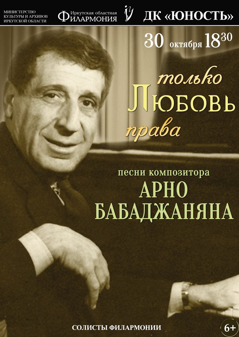 30 октября коллектив Иркутской областной филармонии предлагает вниманию жителей города Саянска концертную программу «Только любовь права» по произведениям композитора А. Бабаджаняна.