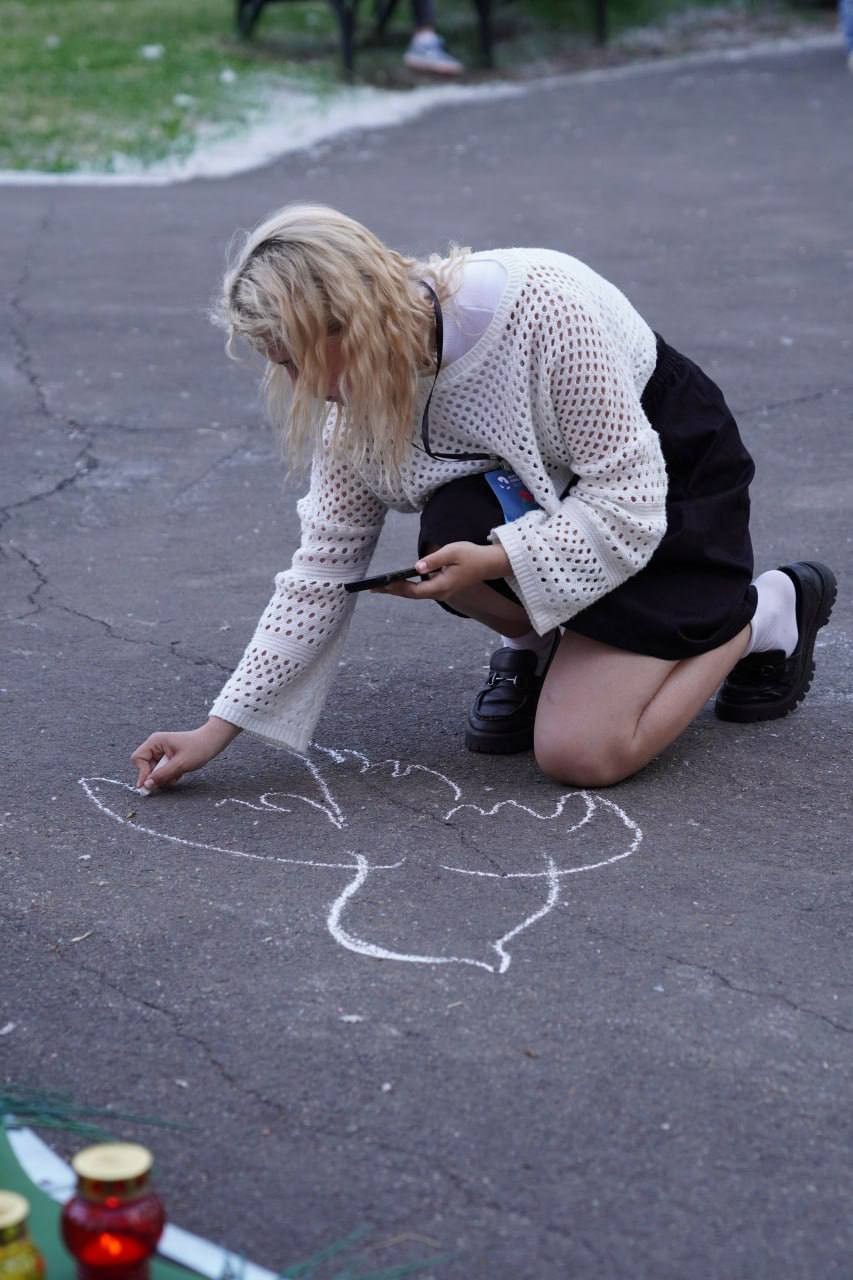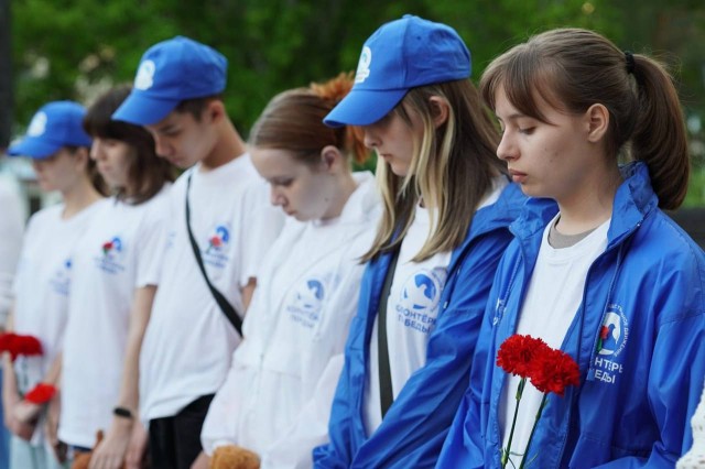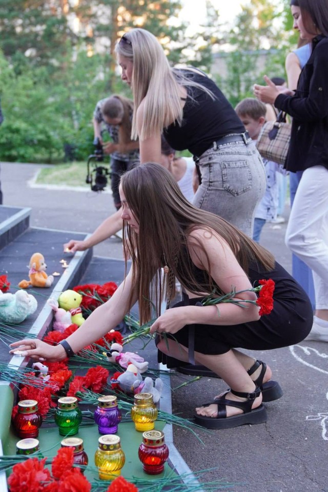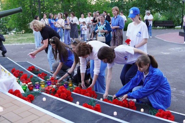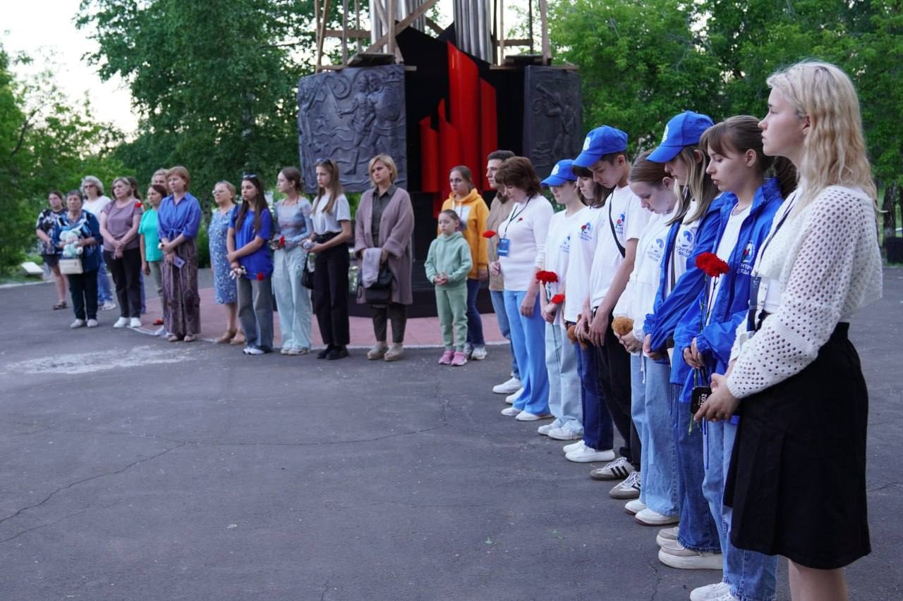 Вместе с неравнодушными саянцами юные добровольцы возложили цветы и игрушки к мемориалу, зажгли свечи и почтили память погибших минутой молчания.