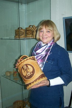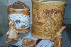 Более двадцати лет назад мастерство работы с берестой освоила Вера Верхотурова. Вере Ивановне по силам изготовить из этого природного материала абсолютно все – украшения, посуду и даже куклы. На выставке ее авторские берестяные игрушки представлены в большом количестве. Среди них – девочка, собирающая в лесу грибы, русский мужичок в шапке с заломом. Для изготовления таких мини-кукол она нередко использует спички и булавки. У нее уникальная методика работы с берестой. Она позволяет мастерить изделия из крошечных деталей. Самая крошечная работа Веры Верхотуровой в диаметре составляет всего один сантиметр.