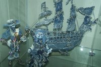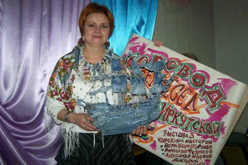 Множество работ из бересты и знаменитое «джинсовое фондю» представила Виктория Циглер. Открытием выставки стали ее изумительные корабли из ткани «деним» – плотной джинсовой ткани из Франции. Виктория нарядила в нее паруса своей флотилии – трех кораблей: Нинья, Пинта и Санта-Мария.